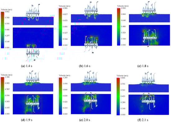 Through EDEM post-processing setup selection, we set the color of the movement speed of the soil particles under the tool. The velocity of soil particles at the position in contact with the tool was high, and the cutting soil tended to move upward along the rotary tillage knife. The cutting simulation process is shown in Figure 9.