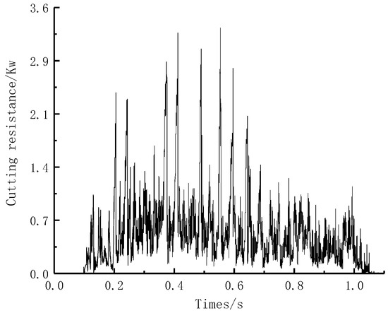 The working resistance of the rotary blade roller is shown in Figure 10, and the variation rule of the torque of the blade shaft is similar to its trend. In the process of rotary tillage cutter roll cutting, when the tool did not contact the soil, the cutting resistance was 0. With the rotation of the roller, the rotary tillage cutter gradually contacted deep into the soil and the cutting resistance increased gradually. With the advancing and rotating motion of the rotary blade roller, the area and volume of the soil contacted by the blade increased, and the depth of the plow gradually increased. When the maximum depth of the plow was reached, the resistance of the blade roller also reached the maximum. When the maximum tillage depth was exceeded, the contact area of soil, the volume of soil cutting, and the corresponding resistance of the cutter roller decreased. The cutter roller rotates 720° within 1 s, so the cutting resistance of the rotary cutter roller presents two periodic changes. These results are consistent with the theoretical analysis under the actual setting parameters, further validating the simulation results. Subsequent rototill field tests will be conducted for soil disturbance observation and comparison to verify the accuracy of the discrete-element simulation.