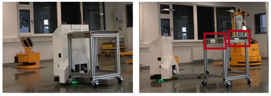 An example of an adversarial attack. On the left, the normal situation is shown. On the right figure, one object has adversarial patch(es), which results in the anomaly. More specifically, the AGV cannot detect the object correctly.