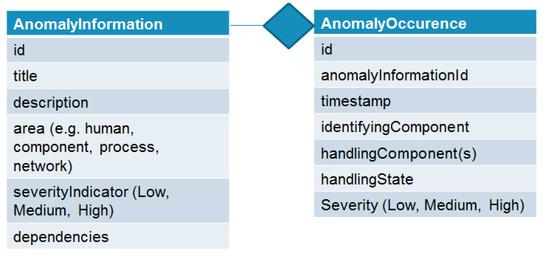 In the anomaly detection approach, the available robot fleet data base is used, which was designed originally to store information on robot fleet performance, such as performed jobs, driven distances, etc. To address the need for anomaly representation, two new categories were implemented in the database. The first category, anomaly information, provides general information on possible anomalies without having a real occurrence of the respective anomaly. The second category represents an anomaly occurrence, referencing an anomaly and adding the case-related information. The included information in both categories is shown in Figure 2.