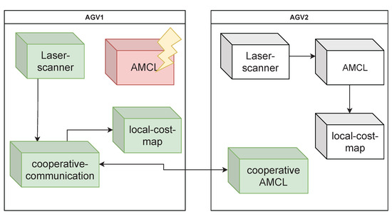 In this example, it is assumed that the AMCL-service is not available due to an adversarial attack. Thus, AGV1 is not able to navigate in the factory layout. AMCL uses the data from laser scanner as an input to calculate the location of the AGV and its surrounding objects. AMCL data are then used to the allocate the AGV and the identified objects in a preset local-cost-map, which is used as a basis for the navigation of the AGV. By identifying the misbehavior of AGV1, a trigger with an identification of the misbehaving service is deployed to the reconfiguration. By setting a trigger, reconfiguration is used to find a replacement for the AMCL service and thus restructure the current configuration. To create new configurations, SoR uses data from a service catalog that indicates all available services within a SoS and blueprints. Blueprints are templates of different configurations that are constructed by services. A configuration can be deployed by using different types of services that handle general functionalities such as sensing, acting or computing. To continue the interrupted navigation process, the AMCL service must be replaced. Therefore, a cooperative AMCL service running on AGV2 is used instead of the local AMCL (attacked on AGV1). In order to use the cooperative AMCL service, a cooperative communication across system boundaries has to be started. The cooperative communication service enables the communication of the AGV1 laser scanner and AGV2 cooperative AMCL service. With successful verification, the planned configuration can be deployed to AGV1 and AGV2. The new created configuration now consists of the following: