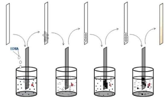 The scheme of SILAR-deposited tin sulfide thin films reproduced with permission from [31], Springer, 2017. (a) Immersion in the Sn(NO3)2 solution. (b) Rinse in the distilled water. (c) Immersion in the Na2S solution. (d) Rinse in the distilled water.