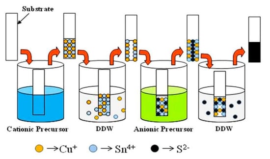 The XRD studies confirmed that the orthorhombic phase of Cu4SnS4 (CTS) and the cubic phase of Cu2SnS3 could be prepared under hydrogen sulfide (H2S) atmosphere and nitrogen and sulfur vapor mixture conditions, respectively. The activation energies were 0.1 eV and 0.06 eV in Cu2SnS3 and Cu4SnS4 films, respectively [32]. The n-type Cu2SnS3 films were prepared on stainless steel in the presence of ethylene diamine tetra acetic acid disodium (Na2EDTA), as reported by Harshad and co-workers [33] and indicated in Figure 2. The sodium sulfide was used as anionic while copper (II) chloride (CuCl2) and tin chloride (SnCl2) acted as cationic precursors. The proposed reaction mechanisms are highlighted in Equations (2)–(5). During the formation of thin films, the substrate was immersed in a cationic solution and anionic solution and then rinsed with double distilled water (DDW) to prevent precipitation (Figure 2).