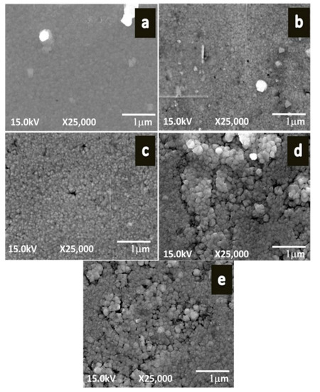 FESEM micrographs of PbS films deposited under various precursor concentrations (a) 0.1 M, (b) 0.15 M, (c) 0.2 M, (d) 0.25 M, (e) 0.3 M at 25,000 magnifications reproduced with permission from [86], Materials Science-Poland, 2016.