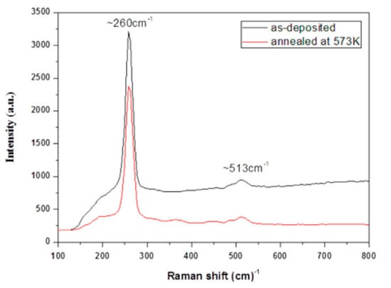 During the experiment, copper sulfate and Na2SeSO3 solutions were used to provide cationic and anionic, respectively [113]. The formation of thin films took place on a glass slide at room temperature by using tartaric acid under 60 deposition cycles. Film thickness (130 nm) and deposition rate (2.17 nm/cycle) were studied by using the gravimetric method. The greenish brown and reddish brown colors could be observed in the as-deposited and annealed films (573 K, 60 min, nitrogen atmosphere), respectively. The XRD results showed the tetragonal phase (Cu3Se2); the lattice parameters (a = 6.41 Å, b = 4.294 Å) were reported. The atomic percentages of Cu:Se were 55.23:44.77 and 61.31:38.69 in as-deposited and annealed films, respectively, based on the EDX technique. The Raman spectroscopy showed the sharpest peak at 260 cm−1 in both samples (Figure 6). There was a lower band gap (2.15 eV) in the annealed films due to the phase conversion during the formation of films. Algimantas and co-workers [114] reported on the preparation of Cu0.87Se films on glass slides. The visual observation showed the colors of the obtained films were transparent and then changed to dark gray. The XRD studies showed hexagonal klockmannite phases with four diffraction peaks (2θ = 26.6, 28.1, 31.2, and 50°). The XPS spectrum exhibited binding energy around 932.2–932.4 eV (Cu2p3/2), contributing to the CuSe and Cu2Se phases. The atomic absorption spectroscopy (AAS) analysis showed copper-rich films when the temperature increased (from 40 to 60 °C) during the experiment. Betul and co-workers [115] proposed that the obtained SILAR-deposited Cu3Se2 films were polycrystalline in nature, with uniform morphology (without any pores).