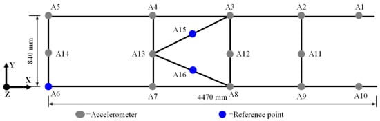 According to the vibration feature of harvesters, accelerometers were not installed on the nodes of the structure. The test points of the accelerometers are shown in Figure 3.