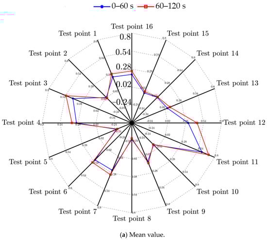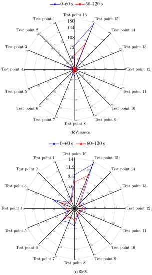 We measured the vibration data in the time domain of 16 test points under operating conditions and calculated the statistical characteristics of the mean, variance and root mean square (RMS); the results are shown in Figure 5. In the two different time periods, the mean, variance and RMS of vibration signals have large differences. In the two different time periods (0–60 s and 60–120 s), the maximum difference in the signal mean is 0.8633, while the maximum difference in variance is 171.1629, and the maximum difference in RMS is 11.3767. Therefore, it can be considered that the vibration signal in operating conditions satisfies the non-stationary random signal condition, and other characteristic analyses are based on this conclusion.