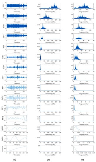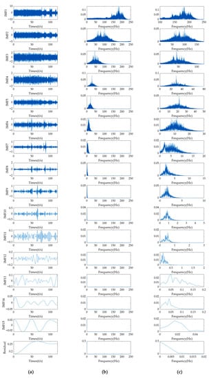The EMD method is used to analyze the vibration of 16 test points, but due to the large amount of data, this paper only shows the analysis result of test point 1. As shown in Figure 6, IMF1~IMF15 and the signal residual components are obtained by decomposition. Column a is the time-domain waveform of the IMF obtained by EMD method, column b is the FFT spectrum of column a, and column c is the local enlarged view of column b.