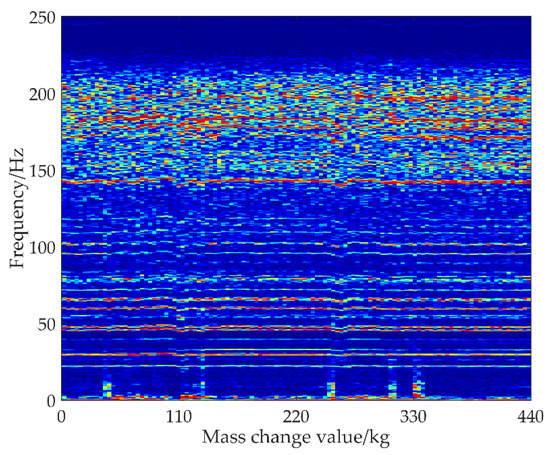 It shows that the peaks of the frequencies appeared as straight lines, and the change of frequencies is small. At the same time, it was found that the relationship between the frequency of the harvester and the mass is not obvious, and it can be considered that when the feeding amount situation is small, the influence of weight change on frequency is relatively small.