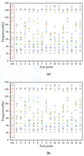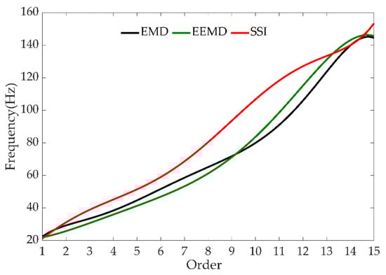 The 15 main frequencies of the 16 test points extracted from the EMD and EEMD results are compared with the modal frequencies calculated by SSI, as shown in Figure 9. The EMD and EEMD lost some frequencies between 100 and 140 Hz (order 9–13 of modal frequencies). Frequency components such as 24 Hz, 26 Hz, 37 Hz, 75 Hz, 82 Hz, and 94 Hz exist in the EMD and EEMD results, but do not exist in modal frequencies. These errors may be caused by the coupling system.