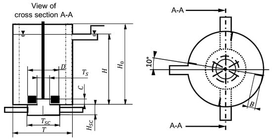 The object of investigation was a fully-baffled cylindrical pump-mixer based on a General Mills design schematically shown in Figure 2. The mixer has an inner diameter of = 300 mm and a total height of = 390 mm. With the overflow weir, the liquid height in operation was constant at = 360 mm, providing a = 1.2 ratio. This is slightly diverging from the literature [,] with = 1. The tank is equipped with a 6-blade Rushton turbine impeller with a diameter = 100 mm mounted on a 26 mm shaft driven by a stirring unit (Heidolph instruments & Co. KG, RZR 2052 control, Schwabach, Germany). The impeller disc was 75 mm in diameter and 2 mm thick. The impeller blades are equally spaced and have a width of 25 mm, a height of 20 mm, and a thickness of 2 mm. The lower edge of the impeller is 1 mm above the suction orifice and therefore has an off-bottom clearance = /36 = 10 mm (measured from the suction orifice to the impeller disc).
