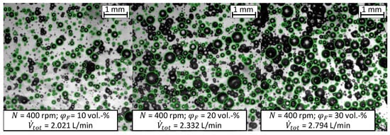 The droplet diameters were analyzed by a Convolutional Neural Network (CNN) published by Schäfer et al. [] and exemplarily depicted in Figure 4. The CNN can reliably detect the droplet diameter [,,]. The number distribution, and the volume distribution, are calculated by neglecting 1% of the largest drops of each measurement to systematically exclude erroneous detections by the CNN. A constant droplet diameter class width of = 20 µm was used throughout and the Sauter mean diameter was calculated from the second and third moment of the distributions as described elsewhere []. In one measurement run (1500 images), between 124,000 and 550,000 droplets were analyzed, ensuring statistical significance.