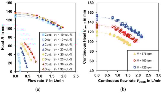 (a) Measured heads and flow rates for = 400 rpm. (b) Measured heads and flow rates of the continuous phase for = 375, 400, and 425 rpm for all measured feed phase ratios. The lines are the pumping curves calculated as quadratic polynomials as a guide for the eye.