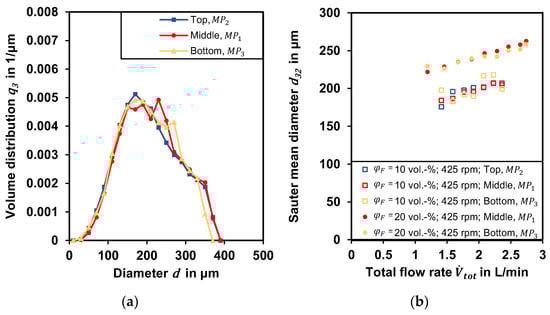 The normal distributed shape, slightly shifted to a log-normal distribution of the DSD, can be observed in a good approximation for all measured droplet sizes. This indicates a weak coalescence tendency that was already observed in our previous work using the same chemicals []. Hence, the DSD is well represented by the Sauter mean diameter, , being depicted for = 425 rpm and feed phase ratios of = 10 and 20 vol.-% in Figure 6b. It can be seen that the Sauter mean diameters were almost identical at different measurement positions and the deviations were within the typical error range of ± 20 µm, which is consistent with our previous studies [,]. A consistent DSD between impeller and pump-mixer outlet could only be confirmed for = 10 vol.-% because of the effects of droplet adhesion at higher values as mentioned above. However, it can be assumed that this is also valid for higher feed phase fractions. The measured Sauter mean diameters for all measurement positions are listed in the supplementary material in Table S2. Since the measured DSDs and Sauter mean diameters are almost equal, it can be assumed that at all measurement positions the DSDs are equal. Since measurement position was the only measurement position at which the DSD could always be measured, the following results and effects are discussed on the Sauter mean diameters measured at .