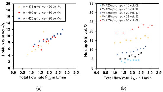 Figure 7a depicts the local holdup, at the measurement position for = 20 vol.-%. It can be seen that all holdup measurements showed a linear relation for different impeller speeds. The local holdup, was between 4 and 12 and is clearly lower than the feed phase ratio , indicating a significantly shorter residence time of the disperse phase in the pump-mixer than the continuous phase. This effect decreased with increasing flow rate, which was also observed by Tang et al. []. We can assume that this is less pronounced with increasing impeller speed, but the relationship between flow rate and impeller speed must be considered. As the flow rate depends on impeller speed, this behavior cannot be clearly isolated. We can assume the effect is based on the flow rate and the mean residence time rather than on the impeller speed because identical flow rates lead to equal local holdup independent of the impeller speed. The general trend of lower local holdups with higher mean residence time was also found by Singh et al. []. Additionally, they found a holdup larger than the feed phase ratio. This was the opposite in our work, which can be explained by the comparably small mean residence times ( = 0.5 to 2 min) in the work of Singh et al. [] compared with the ones in our work ( ≈ 8 min to 33 min).