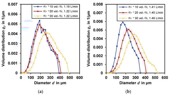 Figure 8a shows that the distribution shifted towards larger drops with increasing feed phase ratio, if the impeller speed and flow rate were kept constant. This could be seen with all investigated impeller speeds and flow rates only if the feed phase ratio was varied. This is consistent with observations in literature for batch vessels [,]. In general, higher phase fractions lead to more collisions between droplets and therefore increase coalescence. Nevertheless, the degree of the influence of the feed phase ratio, on the DSD depends on the impeller speed, too. The effect of = 10–20 vol.-% was rather small for = 375 rpm (see Figure 8a) and larger for > 20 vol.-%. At higher impeller speeds, this effect becomes equally pronounced, which can be seen in the distributions depicted for = 425 rpm in Figure 8b, where the effect of on the DSD was almost equal for all feed phase fractions. This effect was also visible in the Sauter mean diameters, which are exemplarily depicted for = 425 rpm in Figure 9a. All measured DSD data are listed in the supplementary material in Tables S3–S292.