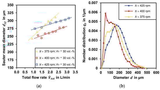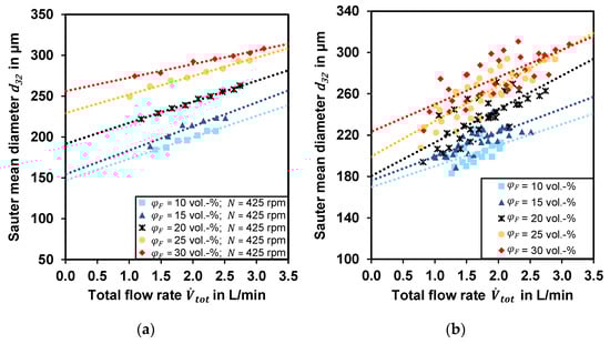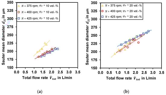 Figure 9b shows the Sauter mean diameter as a function of the total flow rate of all experiments without considering the impeller speed. We can conclude that increasing the feed phase ratio increases the Sauter mean diameter and increasing the flow rate has the same effect but has less impact than the feed phase ratio. The slope of the dashed lines in Figure 9b show that the influence of the flow rate seemed to vary at around = 20 and 25 vol.-%. Additionally, while the values for = 10, 15, and 30 vol.-% were close to their least square lines, the values for the feed phase ratios = 20 and 25 vol.-% were scattered.