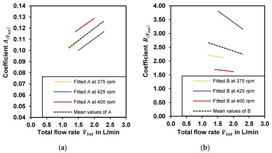 The ordinate, , and the slope, , at each impeller speed showed approximately similar values. A larger variation was found with where the slope and the offset varies at different impeller speeds and their values were the largest for = 425 rpm. The slope of is questionable because had an extremely large confidence interval (changing from positive to negative values). We can conclude that the coefficients for only have a small dependency on and , strongly aligning with the Hinze–Kolmogorov theory [] where only depends on the impeller type. The coefficients and are more sensitive to the process parameters, especially at small flow rates (see Figure 12b). Nevertheless, when calculating the mean coefficients for the slope and the offset of and (see Table 3), one overall equation can sufficiently describe the data.