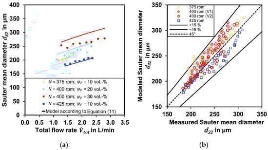 For the modeling of the Sauter mean diameter, Equation (1) was used as the model of Singh et al. [] (see Equation (4)) could not represent our data due to opposing trends caused by much shorter mean residence times. Since Equation (1) does not consider the flow rate, it was modified. The coefficients and were replaced with a linear equation considering the total flow rate, in Equations (7) and (8). For the sake of simplicity, was replaced by and by , leading to the following equations.