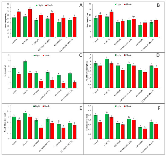 Effect of MLE application on morphological attributes of plant: (A) shoot length (B) root length (C) leaf area (D) Number of leaves (E) Number of tillers and (F) stem diameter, with and without Cd stress under light and subdue light. Different letters above bars represents significant differences (p < 0.05) at each measured point. Values represent mean ± SE of three replicates of each treatment.