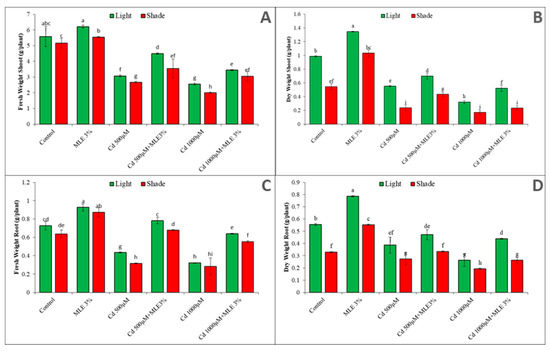 Effect of MLE application on fresh biomass (A) shoot fresh weight (B) shoot dry weight (C) root fresh weight (D) root dry weight, with and without Cd stress under light and subdue light. Different letters above bars represents significant differences (p < 0.05) at each measured point. Values represent mean ± SE of three replicates of each treatment.