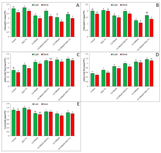 Effect of MLE application on plant pigments (A) chlorophyll a content (B) chlorophyll b content (C) anthocyanin of shoot (D) anthocyanin of root and (E) carotenoids content, with and without Cd stress under light and subdue light. Different letters above bars represents significant differences (p < 0.05) at each measured point. Values represent mean ± SE of three replicates of each treatment.