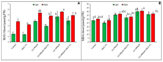 Effect of MLE application on reactive oxygen species (A) H2O2 measure of shoot (B) MDA measure of shoot, with and without Cd stress under light and subdue light. Different letters above bars represents significant differences (p < 0.05) at each measured point. Values represent mean ± SE of three replicates of each treatment.