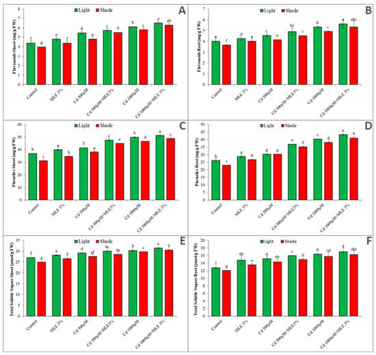 Moreover, both Cd treatments with 3% MLE showed significant increase in root and shoot flavonoids content compared to MLE 3% treatment under both light and shade conditions (light > shade).