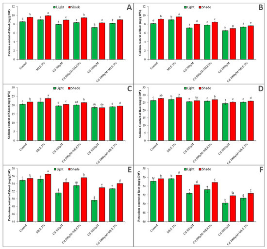 Effect of MLE application on mineral constitutes of plant (A) calcium content of shoot (B) calcium content of root (C) sodium content of shoot (D) sodium content of root (E) potassium content of shoot and (F) potassium content of root, with and without Cd stress under light and subdue light. Different letters above bars represents significant differences (p < 0.05) at each measured point. Values represent mean ± SE of three replicates of each treatment.