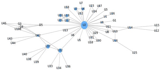 A netlist usually contains hundreds or thousands of components and connections, but it is usually of interest to ICs with more pins and important connections. In order to better view the connection relationship of each node in the entire netlist and analyze the functional structure of the entire netlist, it is necessary to visualize the netlist. Because the module partition is centered on the IC chip, in order to simplify the visualization of the netlist, only the connections between the IC chips in the netlist are considered. Among them, IC chips include memory chips, CPU, FPGA, power chip, DSP (digital signal processor), AD/DA, MCU (microcontroller), MEMS, active crystal oscillator, etc., as well as various customized SOCs. Our netlist visualization focuses on the topology structure obtained after ignoring power nets, GND nets, and other two-pin components and non-active multi-pin components in the netlist, and retaining the core components and core networks. The visual analysis of the netlist can highlight the dependencies between the core components in the netlist and inspire hierarchical module partition. As shown in Figure 1, the solid ellipse is the core component IC, and its size is proportional to the number of pins of the component, and the black solid line is the connection relationship. Components with more pins are in the center with close connection to the rest, and components with fewer pins are scattered around the edges of the graph. For example, in Figure 1, the largest U2 chip is an FPGA, the second largest, U32 and U37, are AD chips, and U3, U4, U19, U20, U21, and U22 are memory chips. Through such simplification for the netlist, it can be seen that the connection between IC and IC is a node-to-node association. Therefore, it can be considered to simplify the netlist into a plane graph instead of a hypergraph, which effectively reduces the complexity of netlist partition.