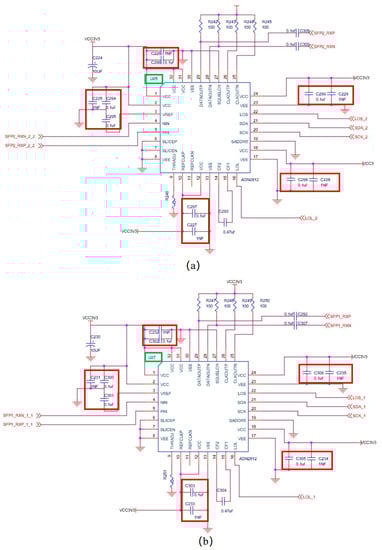 Repetitive pattern. Panels (a,b) are two of the same IC modules from a single netlist, U25 and U27, in green blocks. The capacitors in red blocks between the power net and GND net are scattered, and would be allocated equally by IC module matching in Section 4.5.