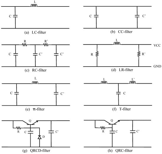 Generic circuit pattern: There are many generic circuit patterns in both digital and analog circuits. Here, we take the filtering circuit for example. The voltage output by the rectifier circuit is a one-way pulsating voltage that cannot be used directly for the electronic circuit. Therefore, the output voltage should be filtered to eliminate the alternating current (AC) component in the voltage, and then it will be used by the electronic circuit after becoming direct current (DC). In the filter circuit, components with special impedance characteristics to AC are mainly used, such as capacitors and inductors. Therefore, there are some fixed circuit structures to filter various electrical signals. Different filtering processes have different characteristics and adapt to different situations. As shown in Figure 3, there are eight kinds of filter circuits, in which R represents resistance, C represents capacitance, L represents inductance, Q represents triode, and D represents diode. These fixed circuit structures are summarized and become fixed patterns. These patterns are not explicit in the netlist, but require to be further discovered. If these fixed patterns can be discovered from the netlist, it would be very useful undoubtedly for the design of circuit partitioning algorithms.