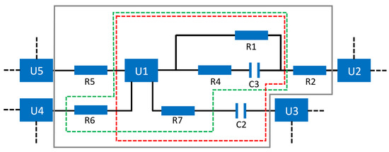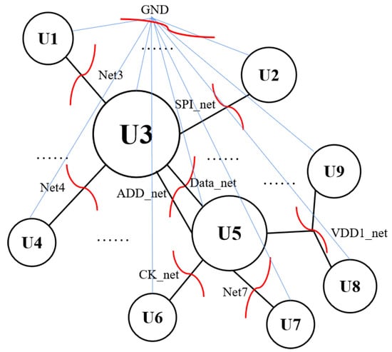 First, we select ICs as key components, for which the most characteristic is that the number of pins are greater than three. A network usually connects multiple IC modules. Each module centers around an IC chip, and many components are connected to serve the IC chip, which should belong to the module. Cutting off the attribute network can form a natural and basic module partition, as shown in Figure 4. Since these components are closely related to the IC chip, there is no significant network attribute labeling on the connection relationship, so they will be automatically divided into the IC module. Assuming that each IC chip is the center, initial partition subsets, denoted by , are formed by cutting important networks, which include the closely related components around them. It is noted that the number of pins of junctors and multi-pin switches are also more than three, but they are ignored in our algorithm since they are passive components and cannot be the center of modules.