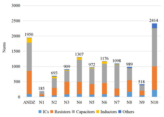 The statistics of resistors, capacitors, inductors, and others for the datasets.