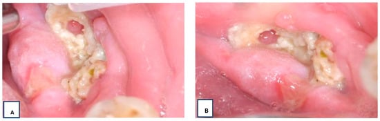 Medication (bisphosphonate)-Related Osteonecrosis of the Jaw (MRONJ). (A,B) A necrotic exposed bone on the left posterior alveolar ridge of the mandible with traumatic ulcer on the lingual side.