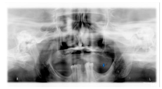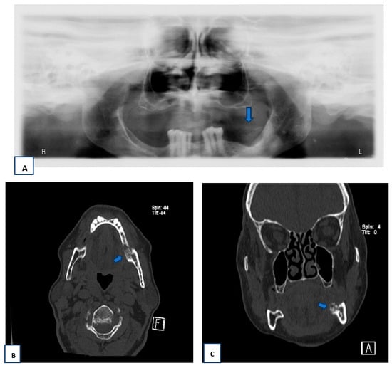Orthopantomogram (OPG) examination showed an ill-defined radiolucent lesion in the molars area of the left mandible (Figure 2A). A multi-detector computed tomography (CT) scan performed with bone window showed an area with cortical bone disruption and mottled radiolucency of the left posterior mandible (Figure 2B,C).