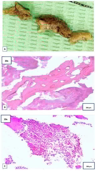 Fragments of necrotic bony (sequestra) were removed and fixed in 10% formalin for histopathological analysis (Figure 3A). Microscopic examinations revealed fragments of non-viable lamellar bone rimmed by basophilic bacterial biofilm (Figure 3B). Dense colonies of bacteria surrounded by granulation tissue with abscess (Figure 3C).