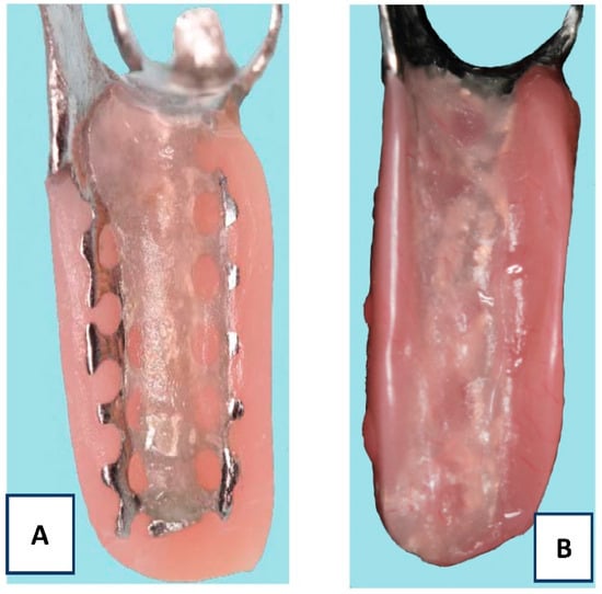 Mandibular RPD denture bases. (A) Old RPD with metal framework exposure. (B) Newly fabricated RPD with proper denture base extension and acrylic thickness.