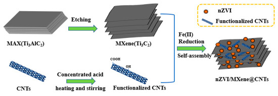 The three-dimensional mesh interlayered nZVI/MXene@CNTs nanomaterials were self-assembled in the given aqueous solution. As shown in Figure 1, the synthesis schematic design of nZVI/MXene@CNTs was depicted. Briefly, the functionalized CNTs and Ti3C2Tx-Mxene nanosheet dispersions were obtained by acid drenching the CNTs and etching the graphite phase MAX (Ti3AlC2), respectively. Then, the functionalized CNTs and MXene nanosheet mixture were distributed in the prepared ferrous-sulfate solution, while stirring constantly under N2 protection. Due to the high surface energy and numerous hydrophilic groups, Fe(II) could be evenly disseminated on the surface of the CNTs and MXene. It would be generated by the sequential assembly of MXene and CNTs and the ordered placement of Fe(II) on their surfaces by water shear and zeta potential difference, producing a three-dimensional interconnected interlayer structure of Fe(II)/MXene@CNTs. Fe(II) was reduced to nZVI and deposited in the layer gaps and interstitial spaces of MXene and MXene@CNTs by the addition of a dilute reducing agent (NaBH4). In this way, a nanomaterial (nZVI/MXene@CNTs), with three-dimensional interlayer structure and excellent adsorption and catalytic properties, was prepared. Additionally, this approach allowed for the simultaneous self-assembly of three-dimensional interlayer nanostructures with a variety of functional groups cross-linked for catalytic or interfacial activities, exhibiting the characteristics of simplicity, efficacy and environmental friendliness.