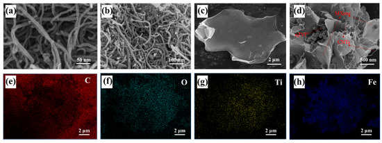 The microscopic morphology and elemental composition of the CNTs, functionalized CNTs, MXene and nZVI/MXene@CNTs were observed by SEM and EDS-mapping (Figure 2). As shown in Figure 2a, there were numerous impurities, such as amorphous carbon and agglomerates, on the original CNTs surface. However, following acidification, the surface of the CNTs became rough, showing a considerable reduction in length, diameter and impurity (Figure 2b). The prepared MXene showed a two-dimensional stack of lamellae (Figure 2c). With the addition of the nZVI and functionalized CNTs, a cross-linked and interlaced three-dimensional intercalation structure was produced, and many nZVI catalytic units were evenly coated on the surface or embedded within (Figure 2d). A considerable number of C, O, Ti and Fe elements were visible in the EDS-mapping energy spectrum (Figure 2e–h), and each element was evenly distributed on the material surface. The original morphology of nZVI/MXene@CNTs was retained after repeated ultrasonic treatment, demonstrating good stability.