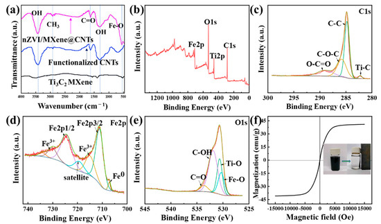 (a) FTIR spectra of Ti3C2 MXene, functionalized CNTs and nZVI/MXene@CNTs; (b) XPS survey spectra of nZVI/MXene@CNTs; (c) C 1s; (d) Fe 2p; (e) O 1s; (f) VSM spectra of nZVI/MXene@CNTs.