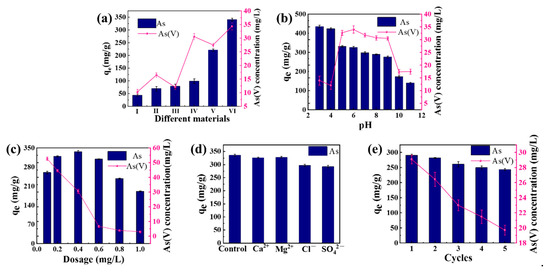 Effect of the (a) different materials, (I–VI representing CNTs, functionalized CNTs, MXene, nZVI/MXene, MXene/CNTs and nZVI/MXene@CNTs, respectively); (b) initial pH; (c) dosage of nZVI/MXene@CNTs; (d) coexisting ionic on the As(III) removal from aqueous solution by nZVI/MXene@CNTs; and (e) reusability of nZVI/MXene@CNTs.