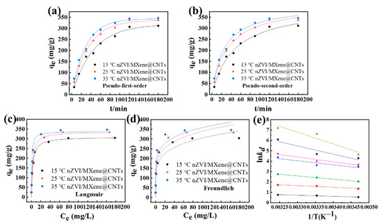 (a) Pseudo-first-order and (b) pseudo-second-order models of nZVI/MXene@CNTs; (c) Langmuir and (d) Freundlich isotherms models of nZVI/MXene@CNTs; (e) thermodynamics of nZVI/MXene@CNTs at different temperatures.