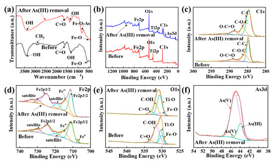 (a) FTIR spectra of nZVI/MXene@CNTs before and after As adsorption; (b) XPS spectra of nZVI/MXene@CNTs before and after As adsorption. High-resolution (c) C 1s; (d) Fe 2p; (e) O 1s XPS spectra of nZVI/MXene@CNTs before and after As adsorption; (f) High-resolution As 3d XPS spectra of nZVI/MXene@CNTs after adsorption.
