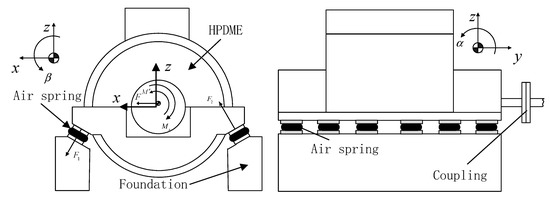 The air springs are arranged symmetrically with respect to the yoz plane and the xoz plane at the same height. The main engine and foundation are treated as rigid bodies. Each air spring is treated as a linear spring. HPDME-ASVIS dynamics equation can be expressed [2] as