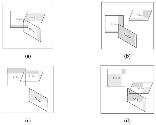 Controllability analysis based on geometric methods: (a) The three convex polyhedrons have a nonempty intersection, and the alignment is controllable; (b) Only and intersect, and the alignment is uncontrollable; (c) Only and intersect, and the alignment is not controllable; (d) Only and intersect, and the alignment is uncontrollable.
