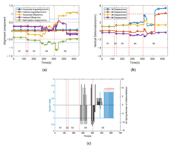 (3) In the S5 state, the effective performance of the horizontal offset and the self-rotation angle is conflicting. The self-rotation angle is controlled into the given control precision range while the horizontal offset is controlled beyond range. At the same time, in the S5 state in Figure 5b, the values of the 1# and 2# vertical displacement also go beyond the given control precision range. In the S5 state in Figure 5c, the system state switches between 1 state and 3 state frequently (1 state represents normal operation, 3 state represents emergency protection), which shows that the air vibration isolation device frequently opens and closes the emergency protector device. At this time, the alignment control system falls into oscillation.