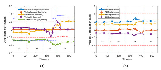 The alignment control process using the alignment autonomous control method: (a) The change of the alignment component; (b) The change of the deformation of the vertical displacement sensor.