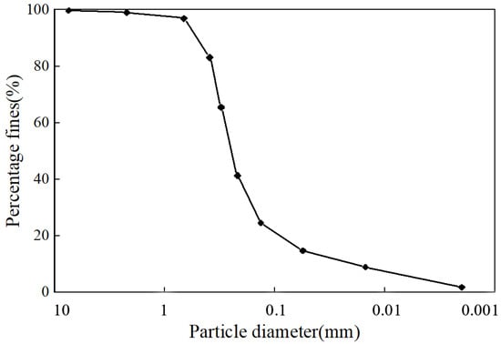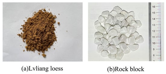 The test sample is a saturated remodeled soil–rock mixture, of which the soil sample is taken from Lvliang, Shanxi Province, and belongs to Q3 Malan loess. According to the “Standards for Geotechnical Test Methods” (GB/T50123-2019), the soil mechanics basic test was carried out on the soil samples. The particle size distribution curve of the soil samples is shown in the Figure 1.