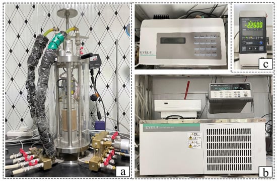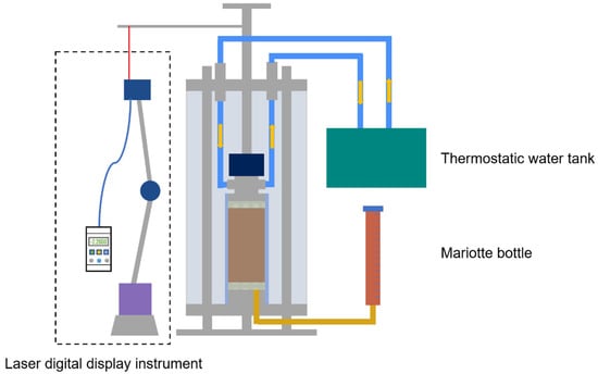 The test used the precision triaxial frost heave tester of the State Key Laboratory of Frozen Soil Engineering to carry out the freeze–thaw cycle test. The main instruments used in the freeze–thaw cycle system are shown in Figure 3 and the schematic diagram is shown in Figure 4. In the test, EYELA’s NCB–3100 precision low-temperature constant temperature water tank was connected to the top plate to provide a ±20 °C circulating cold bath for one-way freezing test, freezing for 6 h, thawing for 6 h, and circulating for 20 times, and the Martens bottle was used for free water replenishment. The top of the sample was equipped with an infrared displacement sensor, which could monitor the deformation of the sample in the vertical direction. The temperature and relative displacement changes were collected by Keysight’s 34972A data acquisition instrument. The acquisition accuracy was 0.01 mm, and the acquisition interval was 5 min. The effects of different boulder contents on the residual deformation of saturated soil under the action of freeze–thaw cycles were systematically studied through the data system of frost heave, thaw settlement, and residual deformation of samples after freeze–thaw cycles.